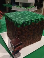 Minecraft is a game where you can explore, create, discover, mine and craft a whole world. In the game it takes patience to build anything. This cake is the same it takes 1,280 tiny fondant squares to make this 3D minecraft logo.