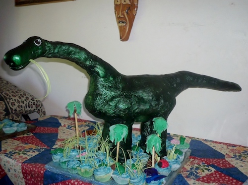 A very large long neck Brontosaurus, (Nessie) for a boys birthday. The boys pretended they were Tyrannosaurus Rex, the boys tore that cake apart. The mother of the BD boy said, “I have never seen kids have so much fun with a cake.”