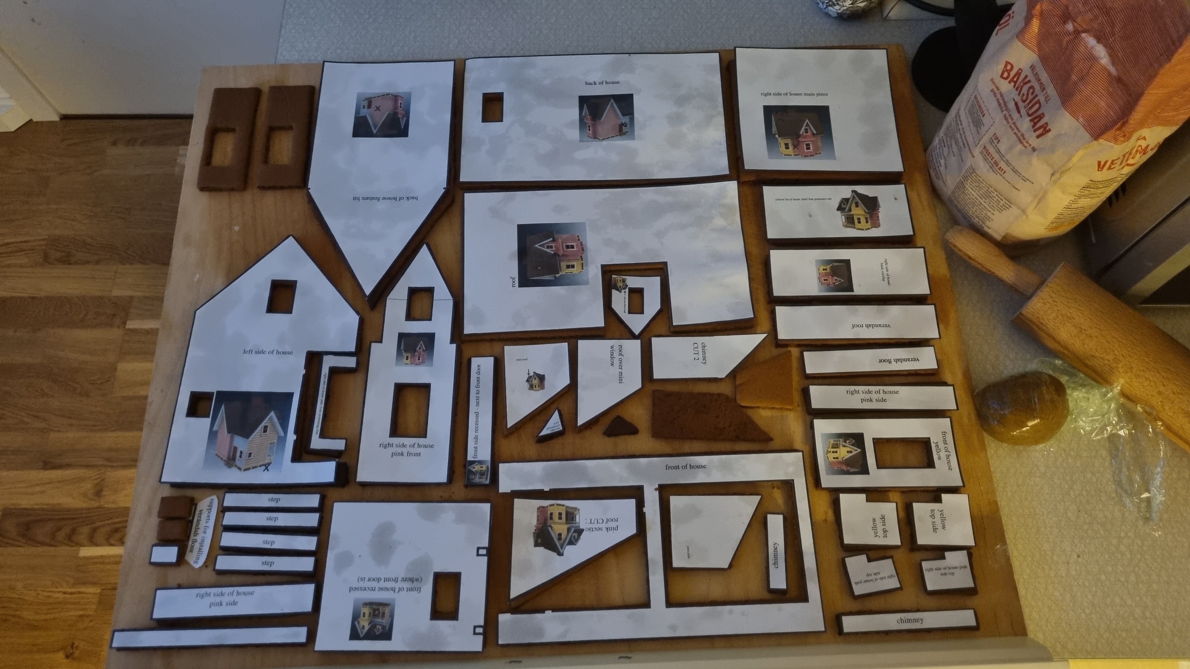 Repeat and make two more batches so you have three batches in total. You will have some left over dough. Do not bake cookies with it until your whole house is assembled. Inevitably with a house this complex you may break a piece or have missed that one of the template bits said ‘x 2’ and need to bake some more.