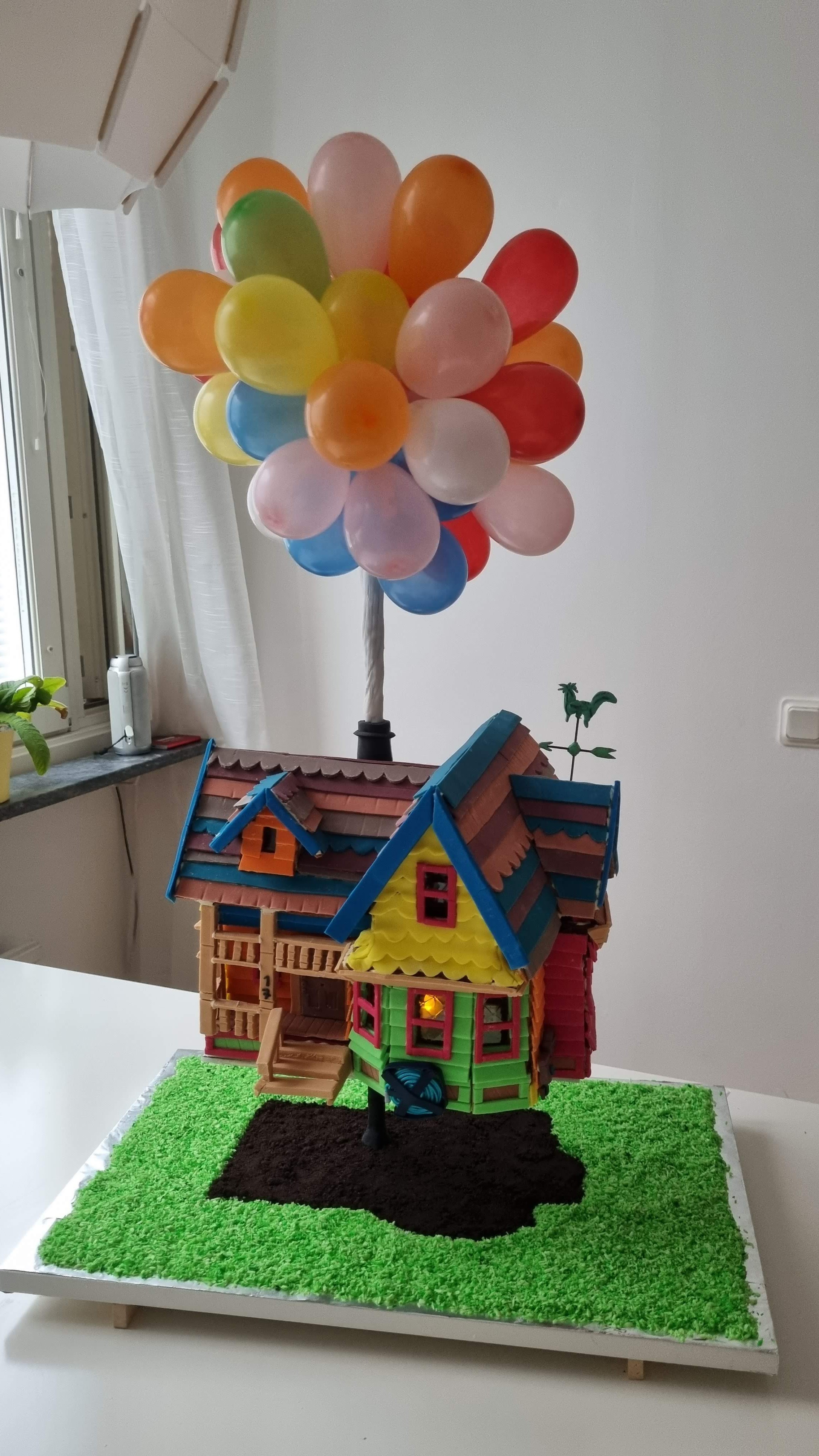 In the image above you will notice that the bunch of balloons is absolutely huge in proportion to the house. I have scaled it down to a more manageable size. If you don’t want to make this aspect of it you can simply buy a few colourful helium balloons to put on top of the house.