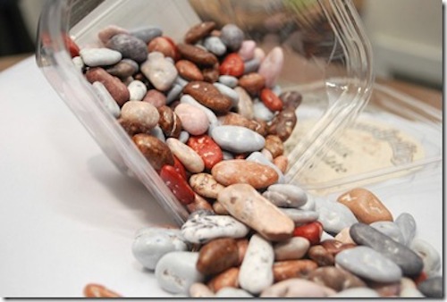 • Hi Joel, I have seen rocks made using white chocolate fudge mixed with oreo crumbs rolled into rock shapes. But if the ones in the picture are like the ones we get here they have more of a candy shell filled with chocolate. The shell on them would probably be made in a way similar to M&Ms and smarties where the chocolates are rotated in large containers as a liquid candy made of sugar and corn syrup is sprayed onto them. Once the coating is dry they get sprayed again and that is repeated until it is strong and then it is sprayed with a final coloured layer. So not something that you could do at home. You could use reusable molding gel to make molds and then colour white chocolate and make chocolate rocks.