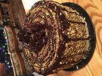 Have you ever been disappointed by a dry and tasteless chocolate cake? Well then this is the recipe for you. This is my all time favourite chocolate cake recipe. It makes a rich moist cake that tastes like chocolate. The photos below are from making four times the quantities listed in this recipe – to make a cake big enough for 100 people. The picture above is from one quantity of this cake, layered with chocolate mousse, centered with orange creme brulee, coated in chocolate glacage and decorated with tempered milk chocolate.