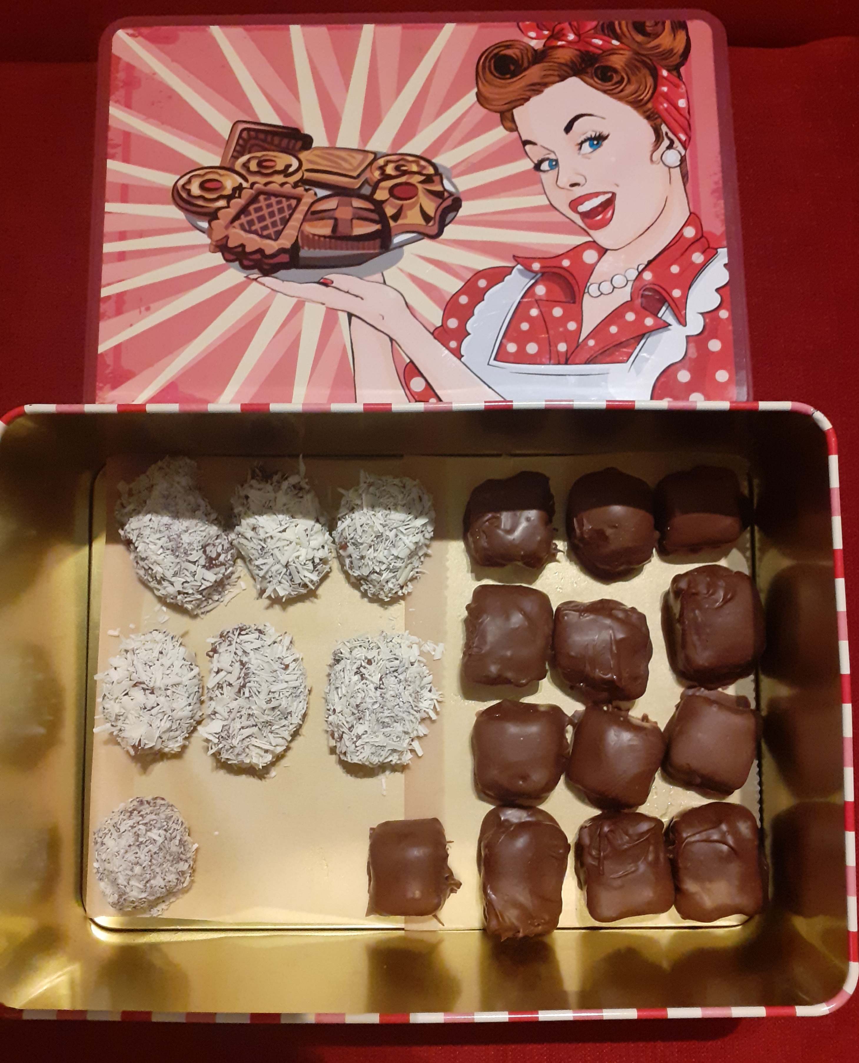 But I thought my chocolate would be enough to cover it fully and I ran dangerously low on it in the end. So they didn’t look as good, as it wasn’t as much dipping them in as it was trying to wrestle the chocolate cover around the filling. Next time I’ll know that and won’t try to use the last bits to cover the filling. Better have good looking Truffles and some dipping chocolate left over. Also when the chocolate didn’t fully cover, some filling oozed out a bit…
