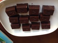 Dip your squares of frozen peanut butter and jelly (jam) into the chocolate and then top with a patterned square.