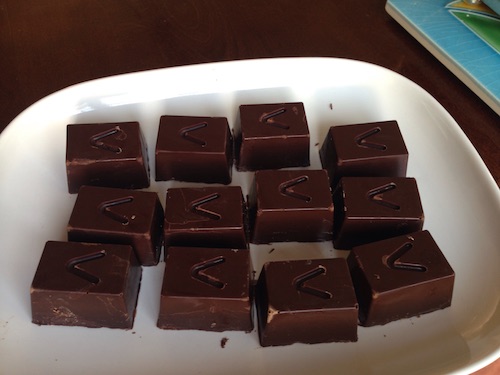 Freeze overnight.  In the morning it will be firm enough for you to cut into squares using a hot knife.   Dip your frozen cubes into tempered chocolate (see this post on how to temper chocolate).  Then use your fork to scoop it out and tap it on the side of the bowl to get off any excess chocolate.