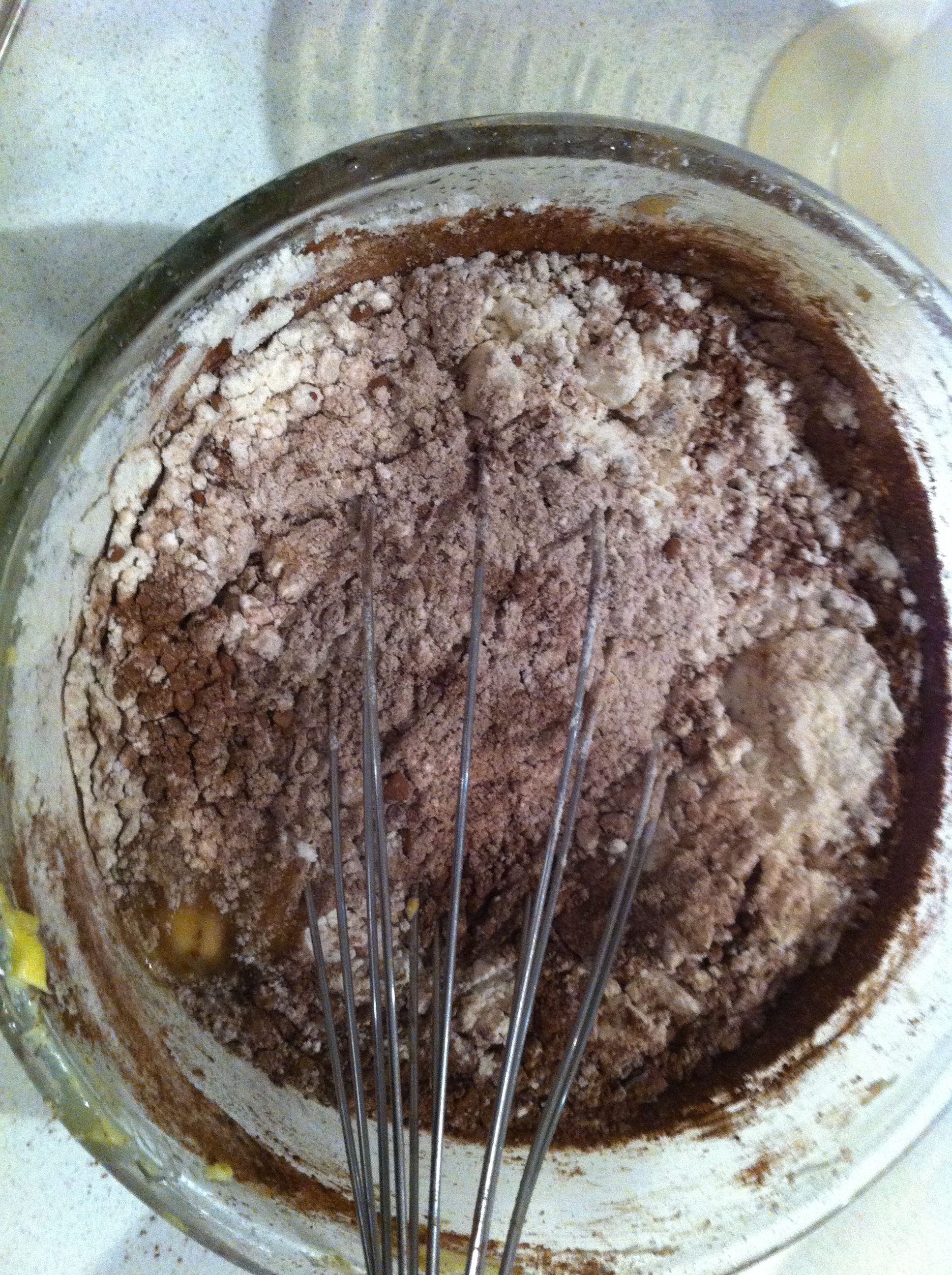 Mix in flour, cocoa powder and baking powder.  Do not over-mix.