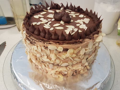 This is a beautiful moist and delicious chocolate cake with the crunch of toasted pistachios and almonds on the side topped off with rich ganache and chocolate flowers. Perfect for Christmas or any other special gathering.