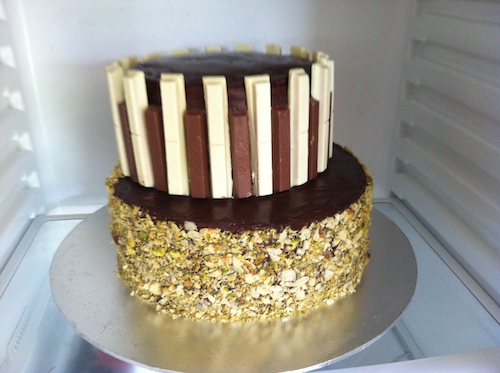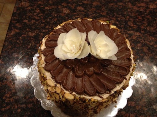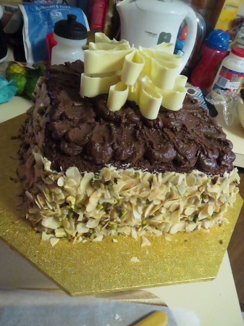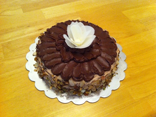 This is a beautiful moist and delicious chocolate cake with the crunch of toasted pistachios and almonds on the side topped off with rich ganache and chocolate flowers. Perfect for Christmas or any other special gathering.