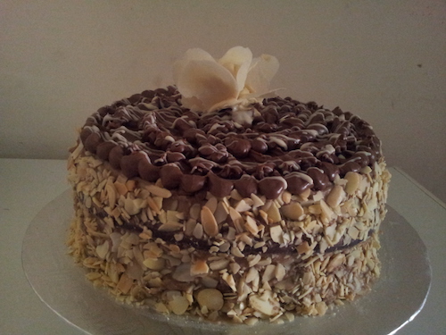 This is a beautiful moist and delicious chocolate cake with the crunch of toasted pistachios and almonds on the side topped off with rich ganache and chocolate flowers. Perfect for Christmas or any other special gathering.