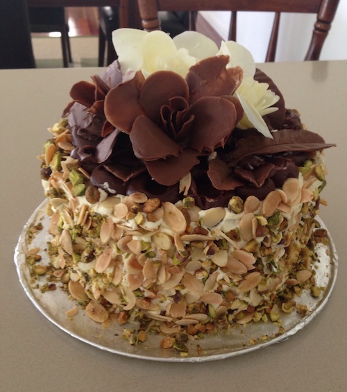 This is a beautiful moist and delicious chocolate cake with the crunch of toasted pistachios and almonds on the side topped off with rich ganache and chocolate flowers. Perfect for Christmas or any other special gathering.