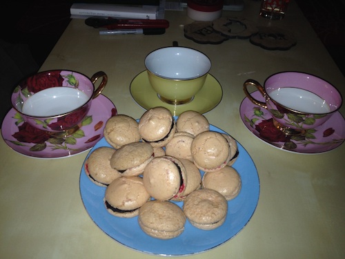 Pipe onto trays lined with baking paper, rap trays on the bench firmly (this prevents cracking) and then bake in the oven for 20 minutes. Check if one comes off the tray cleanly, if not bake for longer. If they are looking done on top move to the bottom shelf of the oven for the remaining time to help bake the base.