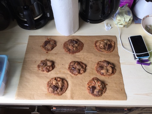A couple of years ago while visiting New York, I tasted a cookie with pretzels in it, they gave the crunch you’d normally get from adding nuts but a slightly different flavor. So when I started experimenting with choc-chip cookies (or biscuits as we call them in Australia), I used these savory snacks to balance the sweetness of the chocolate chunks.