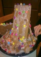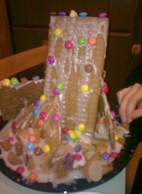 14. Since you’ve mentioned gingerbread houses, I thought I’d share a funny story. They are not very usual where I come from, so when I stumbled on one in a store, I had to try it. It was already baked so all I had to do was glue the pieces together and decorate it. Here’s how my architectural masterpiece turned out. I think I’ll stick to cakes. 😀