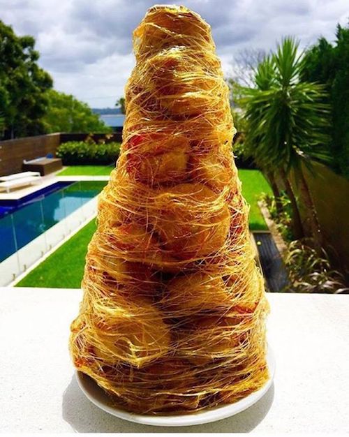 Croquembouche (crockenbush) are beautiful towers of custard filled profiteroles held together with caramelised sugar. This one is then wrapped in fine strands of pulled sugar. It looks impressive as a dessert centrepiece but is surprisingly easy to make.