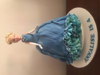 Roll out blue fondant and make ruffles along the bottom edge. Drape it over the back of the cake lining up the frill at the base of the dress.