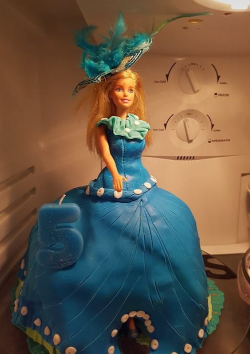 Add the doll with one leg forward. Using the smaller sponge cut a piece and shape it to fit in the gap at the front of the cake and add using frosting.