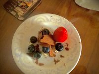 But a chocolate piece onto each plate, line the centre with the fruit that you chose. Pipe the chantilly cream over the top.