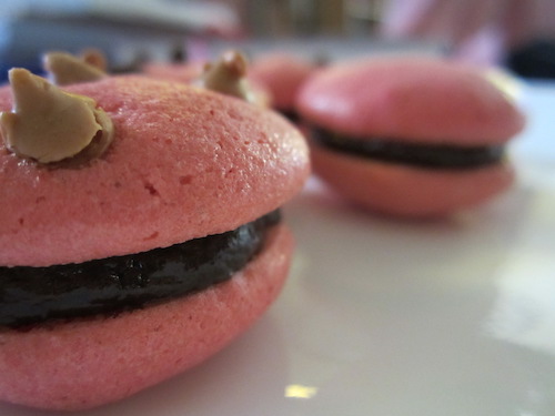 Bring the cream to the boil and pour over the chocolate. Let stand for a minute and then stir. If it is not adequately melted then microwave for 20 seconds and stir – repeat until smooth. Allow to cool and thicken before piping onto macarons.