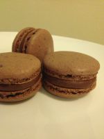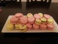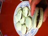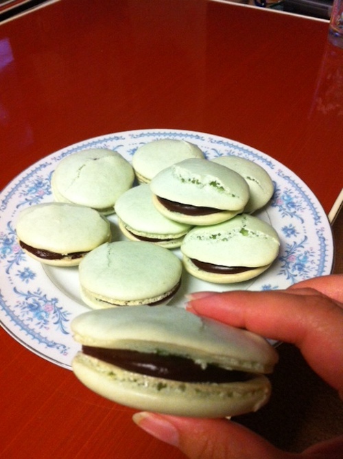 Here's my picture included of my macaroons! ….or whatever is left. Mom and I chowed down on the rejects plain first, then whipped cream from the can, and then chocolate syrup. The filling in these are actually chocolate chips melted in a glass, heat proof bowl over a pot of simmering water with butter. After cooling, they will solidify pretty fairly. I didn't have melting chocolate, nor cream to do the ginache you had up, and I wasn't going to do condense milk either because it's the fat in the cream that I'd need. Because these turned out hollow with some holes, using the Lilikoi butter I made some time ago was out of the question. Thank you so much for having this up! I will be commenting again the next time! Until then, take care! Mahalo, and aloha~ 🙂 🙂 🙂
