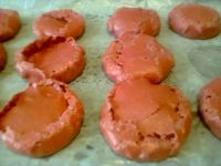 Pipe onto trays lined with baking paper, rap trays on the bench firmly (this prevents cracking) and then bake in the oven for approximately 20 minutes. Make sure you are using NON-stick baking paper or they will stick. Check if the macarons are done by quickly opening the oven and slightly pressing on top of one – if it squishes down slightly it’s not yet ready, close the oven so the oven temp doesn’t change. Taking them out of the oven too soon will mean the insides will drop and you’ll have hollow shells.
