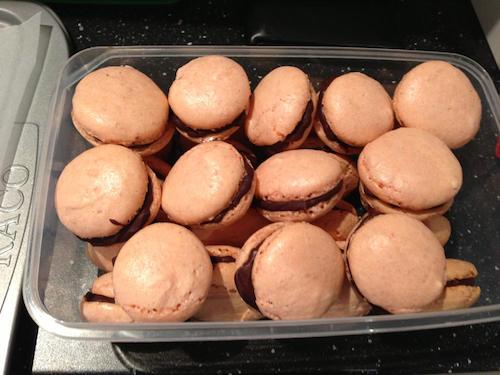 Bring the cream to the boil and pour over the chocolate. Let stand for a minute and then stir. If it is not adequately melted then microwave for 20 seconds and stir – repeat until smooth. Allow to cool and thicken before piping onto macarons.