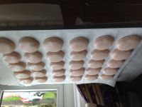 Pipe onto trays lined with baking paper, rap trays on the bench firmly (this prevents cracking) and then bake in the oven for approximately 20 minutes. Make sure you are using NON-stick baking paper or they will stick. Check if the macarons are done by quickly opening the oven and slightly pressing on top of one – if it squishes down slightly it’s not yet ready, close the oven so the oven temp doesn’t change. Taking them out of the oven too soon will mean the insides will drop and you’ll have hollow shells.