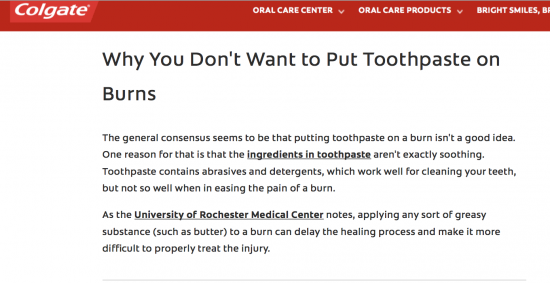 Here is a screen shot from Colgates website about why you should NOT put toothpaste on burns.