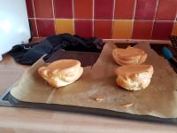Take the hot tray out of the oven, cover with baking paper and spray with cooking oil. Add three scoop full of mixture onto the tray and bake for 2.5 minutes. Open the oven nd add a second scoop on top of each one. Close the oven and bake for a further 5-7 minutes. Take the tray out of the oven, flip the pancakes and return to the oven for 4 more minutes.