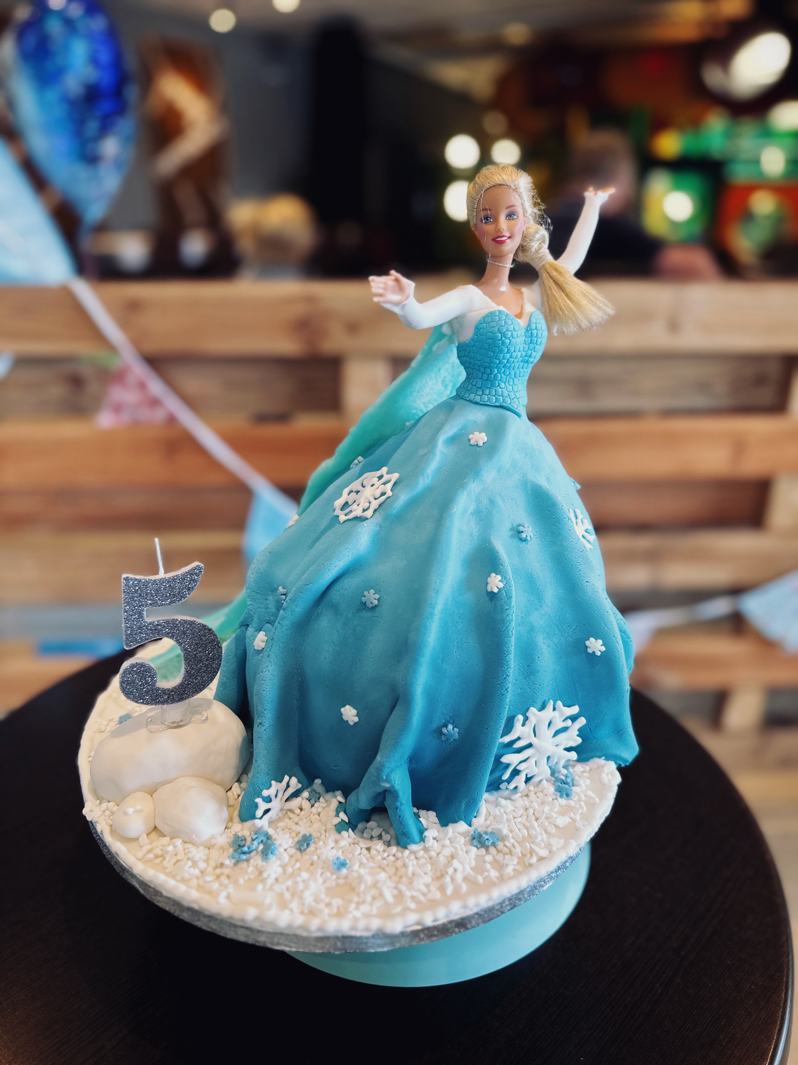 Optional – home made snow flakes and snow around the cake board