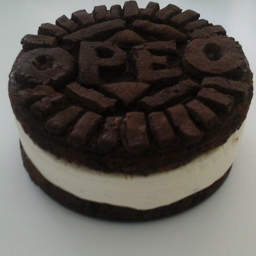 Roughly chop 5 oreos. Pour some mixture into the container and add some chopped oreos to the centre section, add more mixture and continue this until you have used it all. Try to keep the edges completely white by putting the chopped oreo towards the centre.  This recipe will serve approximately 15 people.