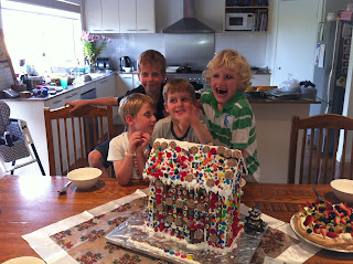 If you have kids decorating then give them a side each, a bowl of lollies and a ziplock bag full of royal icing and let them go for it.  (you might also want a disposable plastic table cloth on the table before they start).  I like to give them a bowl of decorating lollies and a bowl of eating lollies each – all the decorating lollies have to go on the house.
