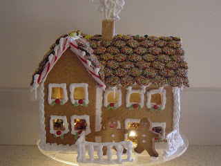 Cover a board with alfoil, and put royal icing along the base and then up the sides of the house.  If needed use cans of food to hold it in place.  Lastly ‘glue’ the roof in place.  Gently wrap in plastic wrap and leave overnight before decorating.