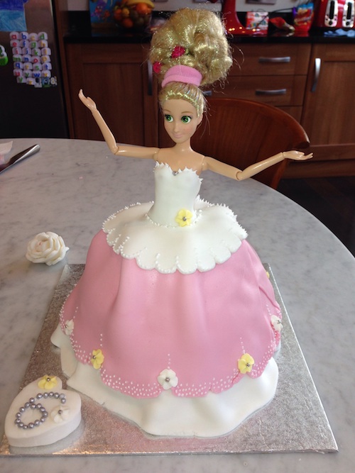 Take your doll and make the hair how you want it to be – this is easier to do while you can hold the doll rather than when it is covered in icing.  If you are having the hair down then you may like to loosely put it up while you are icing.  Surround the legs of the doll in plastic wrap.