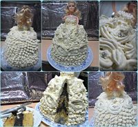 Take your doll and make the hair how you want it to be – this is easier to do while you can hold the doll rather than when it is covered in icing. If you are having the hair down then you may like to loosely put it up while you are icing. Surround the legs of the doll in plastic wrap.