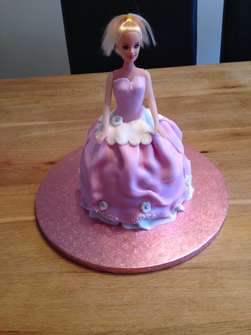 Cover the body of the doll in pink fondant and then using a knife shape the top of the bodice. Place the doll into the cake – bending the legs slightly if it needs to sit lower in the cake. Roll out some white fondant and cut it into a circle. Using the base of an icing tip or small round cutter cut a scalloped pattern around the edge of the circle. Cut a small circle out of the centre of this and then split one side and place around the waist of the doll, cutting off any excess.
