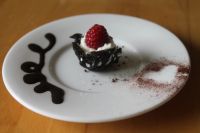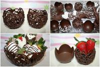 Or in my opinion the best way is to make chocolate bowls using a lined container as a mold. Aluminium foil or waxed baking paper can be used to line a container that is the shape you are after, then pipe your design over the top.