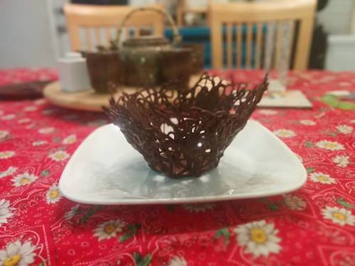 Or in my opinion the best way is to make chocolate bowls using a lined container as a mold. Aluminium foil or waxed baking paper can be used to line a container that is the shape you are after, then pipe your design over the top.