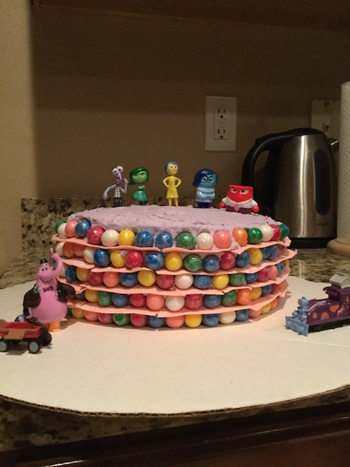 Inside Out cake I made this morning. My daughter didn’t want purple frosting because it represents Fear so we have yellow frosting for Joy.