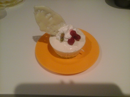 Place the dessert onto a plate, pipe on some whipped cream, add a chocolate decoration, two raspberries and a pistachio. Leave it at room temperature for a couple of hours to allow the raspberry sauce to melt.