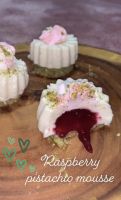 Place the dessert onto a plate, pipe on some whipped cream, add a chocolate decoration, two raspberries and a pistachio. Leave it at room temperature for a couple of hours to allow the raspberry sauce to melt.
