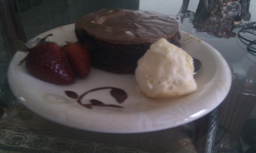 Step 4: Take a spoonful and chocolate ganache oozes out of the centre like molten lava onto the cold plate.
