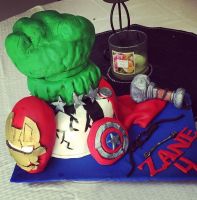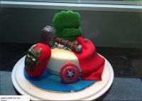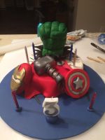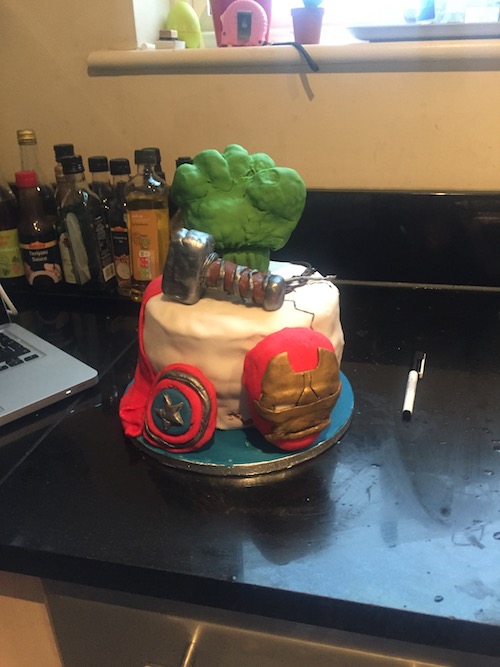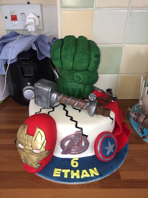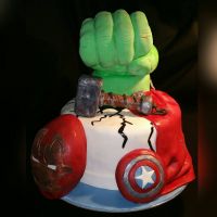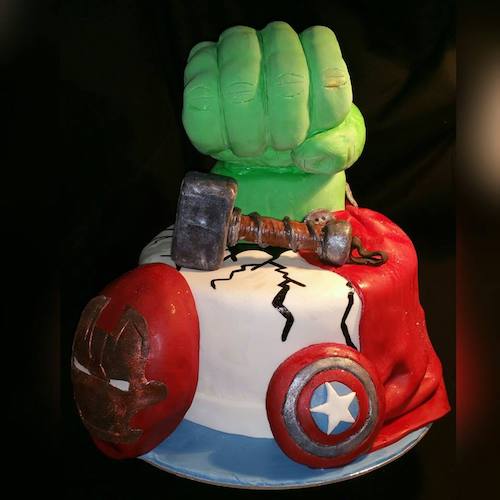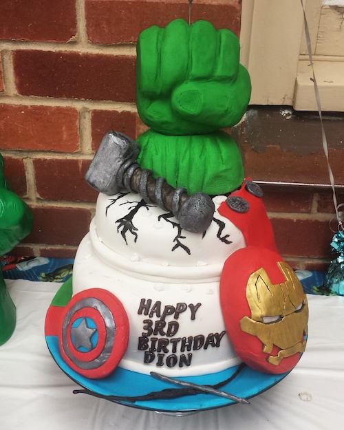 Today we are making a Marvel Avengers cake with Iron Man’s mask, Thor’s hammer, Captain America’s shield, Hawkeye’s bow and arrow and of course Hulk’s massive green fist smashing through the top of the cake. HULK SMASH! This one was for a birthday party held at a public venue and it actually created a bit of a spectacle with lots of people stopping to stare and admire the cake. All part of the fun!