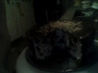 Pour over the base and level the top.  Chill in the freezer until frozen.  Tip out, peel off baking paper.  Place on a plate and decorate, defrost in the fridge before serving. See previous post for instructions on making the chocolate decorations pictured.