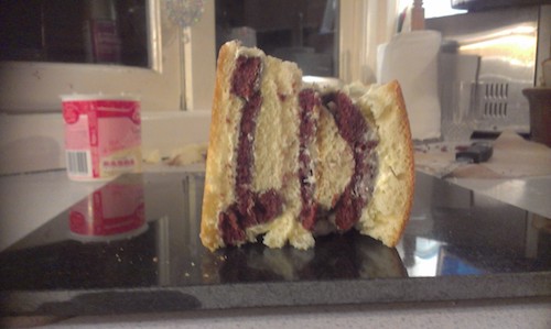 Like should i just bake 1 box of vanilla cake and half of the red velvet?