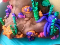 Stack the three cakes with your choice of filling between the layers (jam, buttercream, lemon curd…). Cover the whole cake in buttercream and smooth the sides and then the top. Arrange some coral and seaweed around the edge. And add Sebastian the crab to one side.