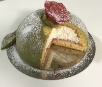 Tip out onto your serving plate. Cover with the half a cup of whipped cream that you et aside earlier. Use some acetate or thin plastic to smooth over the dome.