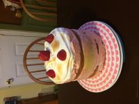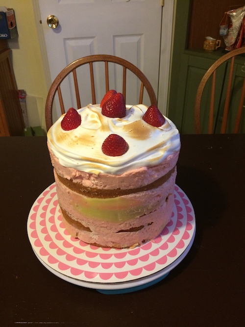 It’s birthday season in our family. If you’re not after a themed cake then my favourite would have to be a layered mousse cake. This one has strawberry mousse, lemon gel, sponge cake topped with italian meringue and fresh strawberries. It is oh so yum! You can’t put fondant over a mousse cake directly as the moisture in the mousse would cause the fondant to dissolve on the inside leaving a gooey layer of sticky liquid in a pool around the cake and potentially causing the fondant to sag.