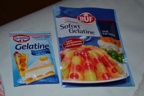 Add the smaller lump of gelatin to the first bowl and stir until all the gelatin is melted. Then set that to one side at room temperature.